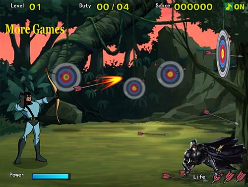 This game has only one scene. Batman shoots at moving target, which is moving up and down in the right side of the screen. To finish level one, you have to hit the target 4 times and you mustn't miss more than twice. Third miss is taking you out of the game. On the second level the target is moving somewhat faster and needed number of hits is 10. In the lower left corner you have a power meter showing the strength used to shoot an arrow. At maximum speed Batman shoots out fiery arrows which are also the fastest. Hit basically depends on two parameters: an angle and speed of the shot, just like in real archery. You use only mouse to play. Mouse movement chooses the angle and left click shoots out an arrow.